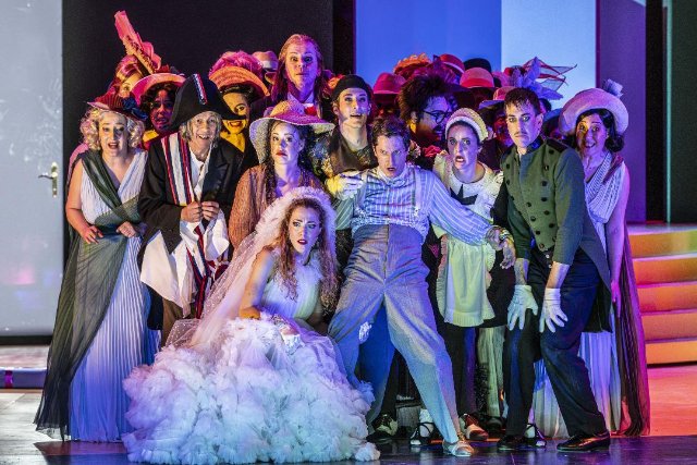 The stage setting by Herbert Fritsch was stark but framed by many differently colored doors that constantly had people come out of and go back through again. Populated by a most colorful array of people in beautiful costumes, outfits of past centuries (by Geraldine Arnold), one had to watch carefully for the next twist in this fast-paced performance of singing and dancing. This work is part of the new festival coined Schall&Rausch (sound and indulgence) of this opera house.