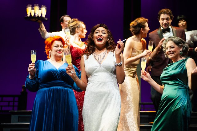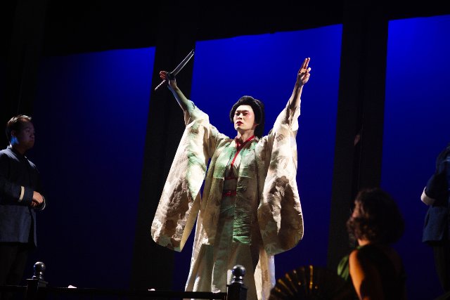 Production values in M. Butterfly are superb. Randy Wong-Westbrooke’s scenic design draws from Chinese black lacquer-work. Mimicking lacquer screens, three concentric black arches with gold designs frame the proscenium, with slick black steps and other angular features dominating the stage. Michael Oesch’s often stark lighting highlights the action, while Keiko Carreiro’s costumes stand on their own and provide sharp contrast with the background. Often, stage wigs can look very phony, but Alexander Class’s wigs for Song are most appropriate.  Final kudos go to James Arp for his sound design which joins the divergent elements of the Asian and Western elements.