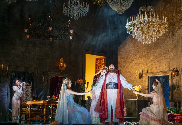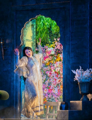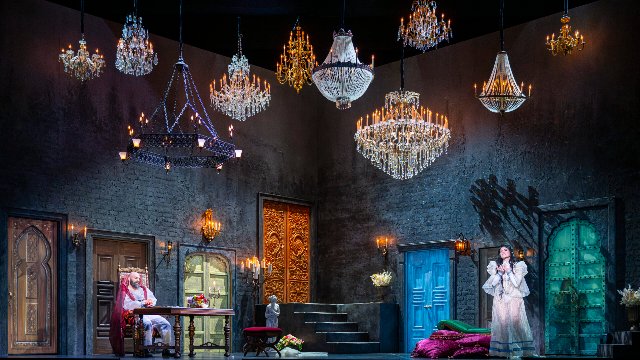 Set Designer Steven C. Kemp’s imposing stage is a great room with spare furnishings but a dozen chandeliers of various designs and seven imposing and unique doors, creating a sense of instability that would not be rendered by repeating identical lighting and portal features.  Interestingly, all of the chandeliers and doors are veterans of past Opera San Jose productions.  How’s that for artistic recycling?