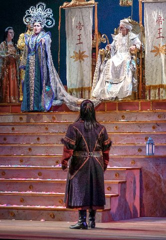 Turandot, Richard Russell, in white robes, appeared as the Emperor in the 2019 Sarasota Opera production of “Turandot.” Photo by Rod Millington.