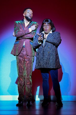 Pam MacKinnon directs, and the production values are as strong as the acting and singing. Jason Ardizzone-West’s clean scenic design effectively uses partitions that close into square apertures, emphasizing the connection with filming. Russell H. Champa’s lighting, Jessica Paz’s sound, and Sarita Fellows’s costumes combine to complete the effective staging.