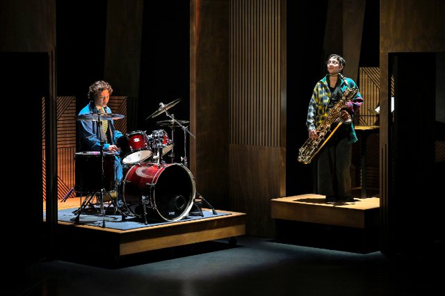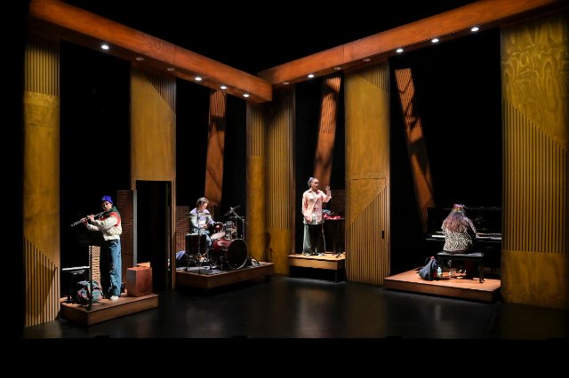 From the start of the play, the element of chance enters. When the fixed story begins, the lively and level-headed singer Fax (Hillary Fisher) is assigned a pianist, the stoner Rile, (Yeena Sung) as an accompanist, and in the middle of Fax’s singing an opera aria, Rile goes on improvisational tear, illustrative of the classical/improv clash. Also joining the fray are the mercurial and mysterious percussionist Margot (Naomi Latta), and what instrument is more inherently improv than drums? Finally, we have the breezy and independent wind player Clementine (Gianna DiGregorio Rivera) in a curiously underwritten part for such a small ensemble.