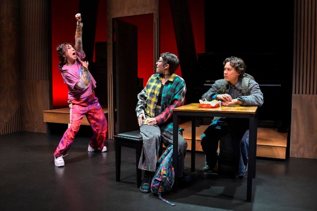 Laudably, ||:GIRLS:||….. reflects its intellectual power throughout with its aspiration to educate along with entertaining, and it particularly benefits and suits a younger audience with a serious interest in music. But as a stage drama it could use more cohesiveness. As somewhat a gimmicky prelude to the action, 12 audience members select 12 keys from a piano on stage, a random outcome, and music is composed and performed by the actor/musicians using only those notes. And while this device is instructive and even interesting, it deflects from dramatic impact of the story line. The play tries to be too many things that are out of balance or don’t mesh together. Also, there was one musical performance in the latter part of the show that was far too long to fit in with an absorbing dramatic pace.