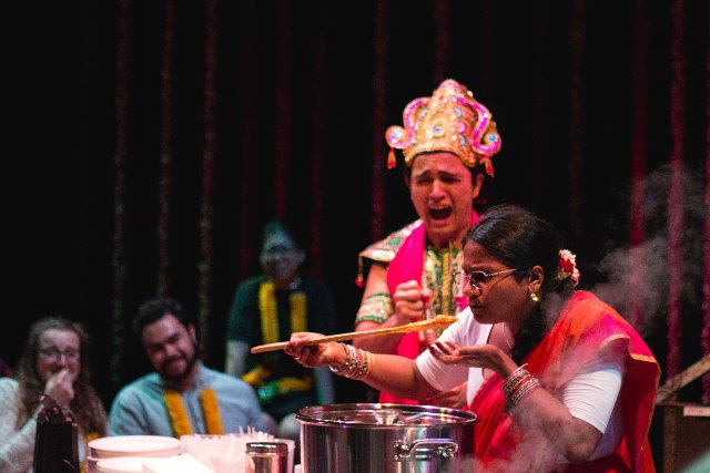 The theatrical conceit is that, to her great surprise, 100 partiers have showed up for Onam, and to feed them, Mrs. Krishnan will have to prepare and cook large cauldrons of dal and rice, which she will do with help on stage as the comedy proceeds. Of course, this format is rife with prospects for calamity, including unpredictable interactions with patrons and complications with preparing the food. This evening survived without a perceivable hitch, unless spilling a large bag of uncooked rice was not intentional.