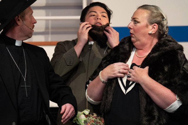 Billy Crocker, the central character, stows away on the S.S. American, on which his boss, a Wall Street magnate, is booked. Much of the plot is about Billy’s travails of not having a passport, a cabin, or clothes, other than what he’s wearing. Nico Jaochico is Billy, and the actor’s fit with the character is evident with Jaochico’s smiling enthusiasm, broad gesticulation, and comic delivery throughout. To avoid detection by his boss and the ship’s captain, Billy is constantly changing guises, including sailor, chef, and female, and the actor gets to display his versatility with voices and affect.