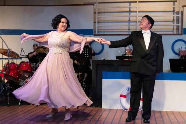 The female lead is nightclub singer Reno Sweeney, who knew Billy before the cruise and had a crush on him. Performed by a compelling Seana Nicol, she possesses a strong singing voice and acting chops, and like Jaochico, has charisma that suits the role. Individually and together, they give fine renditions to the Porter tunes, but one weakness is Act 2’s “All Through the Night,” in which the orchestra arrangement overpowers the singing in what should be a very understated backing. Nonetheless, the decision to have Music Director Armando Fox and the other six musicians on stage and in uniforms creates the feeling of a shipboard orchestra and otherwise works well.
