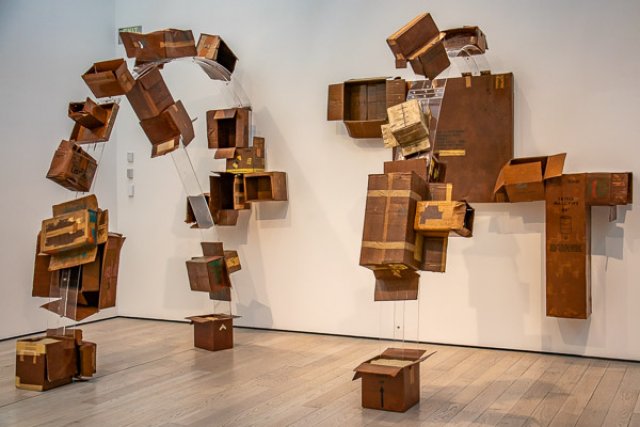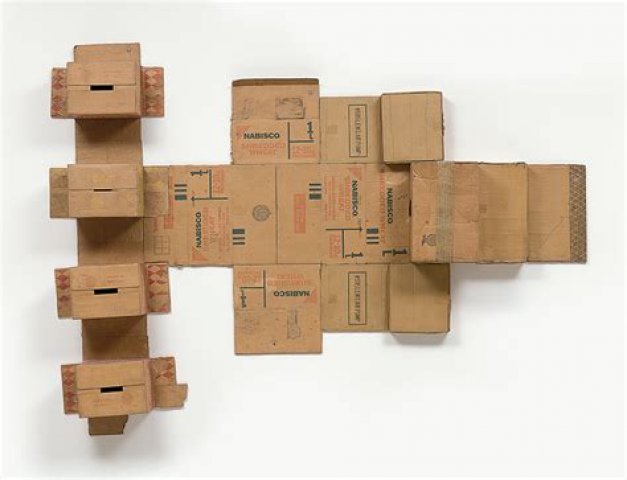 Greg: The flattened carboard boxes were the most notable objects. Notable in my mind, for what an artist could call art. The sheer confidence. The utter entitlement. It was not the work of a novice. Not because a novice couldn’t do it. A guy who could only draw stick figures could do it. I was only vaguely aware of others being there. I was aware of you standing beside me. We were both staring at the crushed box for a minute or so. It looked like a cardboard box (size of a 12-bottle wine box) compacted by someone just stomping on it. I can’t remember what the title card said or if there was one.