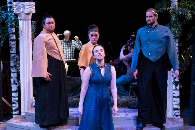 As the mischief-making protagonist Oberon, the King of the Fairies, Kyle Tingson displays a rare, honey-like, easy-sounding countertenor voice that sets the standard and tone for the other artists.  Another standout is tenor Kevin Gino as Lysander who not only displays a wide vocal range but best exemplifies the other compelling aspect of all of the performances, and that is fine acting.  Gino visually and emotionally expresses with the fine detail expected from a straight actor.