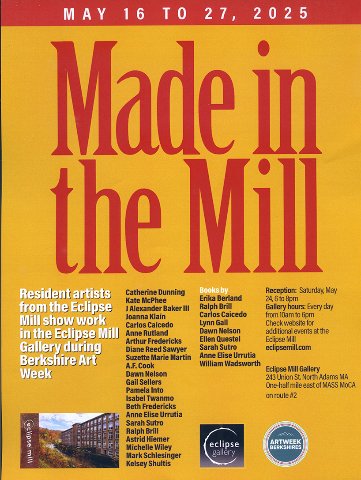 The current exhibition, Made in the Mill, displays the diversity of work that is created in the vast, former industrial complex. In the 19th Century King Cotton reigned in North Adams. Enormous mills were built for different aspects of the process of converting bales of cotton to cloth. The largest complex of mills, Arnold Printworks, later became Sprague Electric. It and other mills lay dormant when Sprague shut down with North Adams devolved into poverty.
