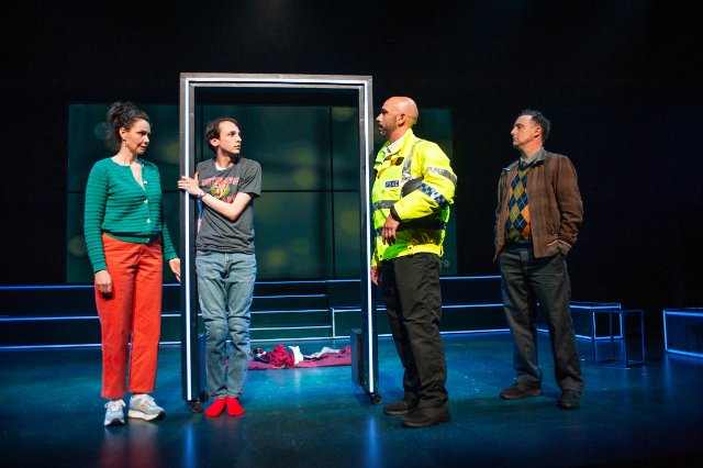 In keeping with Christopher’s compartmentalization and disruptiveness, the action is divided into 57 fast-moving scenes, though a few seem unessential and slow the action. Actors remain on stage most of the time and move frequently in lockstep and other times organically to Bridgette Loriaux’s brilliant movement direction. James Ard’s sound design is pervasive and marvelously detailed from musical blipping to the faint sound of a toilet flushing. This all plays against Bill English’s minimalist but powerful right-angled set framed by light strips and accented by Christian Mejia’s lighting design. On the back wall of the stage, and in keeping with the angular look, Sarah Phykitt’s linear-graphic projections visually reflect Christopher’s mind which favors predictably organized things like computers and machines.