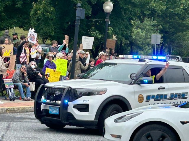 Hundreds of participants crowded around City Hall in North Adams listening to speakers, while additional hundreds more lined the surrounding streets holding up signs, posters and American flags, until a Police car blocked the street at the bridge leading into the city. Organizers at that point had signaled to the police and began to form a march through downtown North Adams. We were circling around several blocks then returned back to City Hall, where the crowd disbursed. Cars that were caught in the traffic stop from different directions were honking, mostly in support of the rally and perhaps not all in agreement.