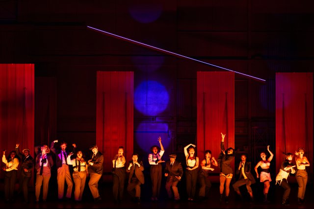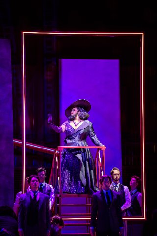 Visual elements on stage are a bit staid until the brothel scenes when they explode. The score makes considerable use of choruses, and the choristers in effect double as a corps de danse who contribute to the overall appearance. Dressed in tawdry black and white, the carnal look and undulating movement is reminiscent of what you might see in Cabaret or Three Penny Opera.