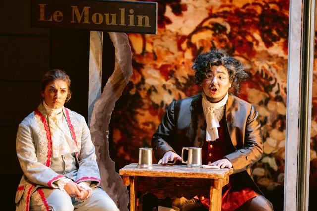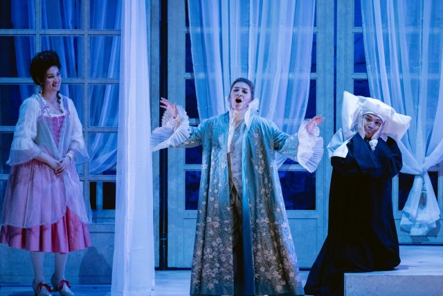 Minghao Liu as Ory not only sings with a classic tenor voice, but exudes charisma as both a singer and actor. He seems to relish being the antagonist and subsuming into the disguises of both the hermit in rags and the habit of a nun. Soprano Eva Rae Martinez is Ory’s quarry, and she hits all of the marks, with a fine coloratura and range to sing the high notes, especially in her “agony” aria.