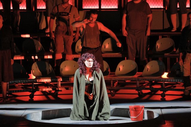 Tanya Orellana’s staging is unusual, with two concentric arcs of plain, light blue-green chairs dominating the set. The concept is that the stage mirrors the seating of the opera house. We are looking at ourselves, so the events on stage then represent the audience. Although the theme of art imitating life appeals, this particular instance is somewhat disturbing, as the characters in the opera dwell in the netherworld of society. This may be how Berg saw the world around him, and perhaps he would see our world today in the same way as the director seems to imply with this interpretation.