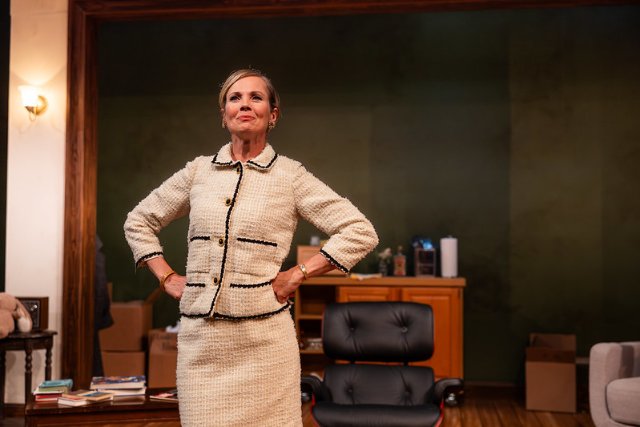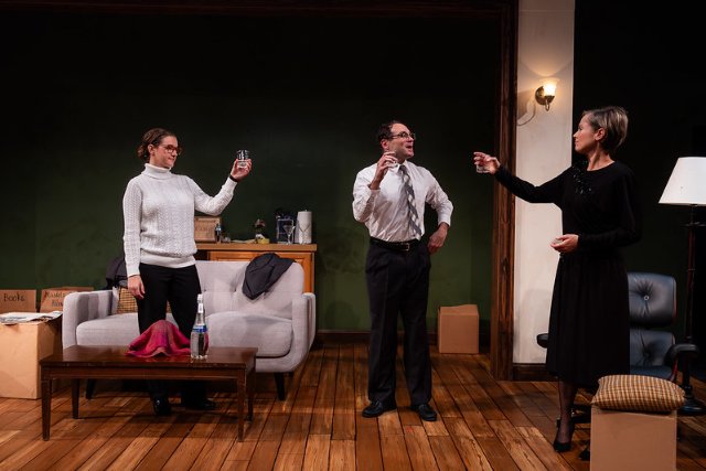 The siblings wax nostalgic while unpacking the stuffed animals of their fraught childhood. Phyllis is in a snit taking a flask of gin from a large handbag with fragments of her peripatetic life. "I need ice" she demands while miraculously Martha extracts an ice tray from one of the boxes. It is one of many such comic incidents with which Vogel softens the harsh edge of tragedy. The writing swings from bathos to slap stick.