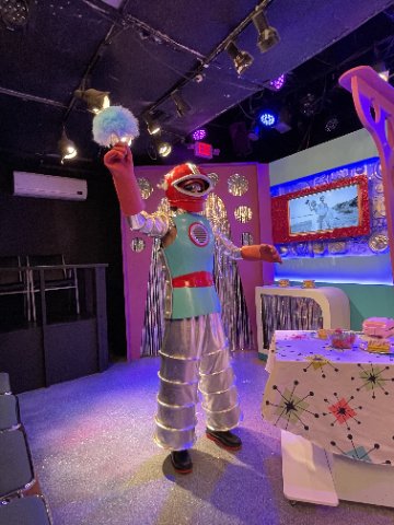 Set and costume designer Andrew Rodriguez-Triana has created a sleek, high-tech playing space that immediately suggests science fiction. Sliding doors, a toy-like robot, video screens, and machinery-like devices signal the futuristic world, while tinsel-strip curtains add a festive, slightly campy vibe. Together, the design combines sophistication with playfulness, preparing audiences for a colorful, upbeat ride.