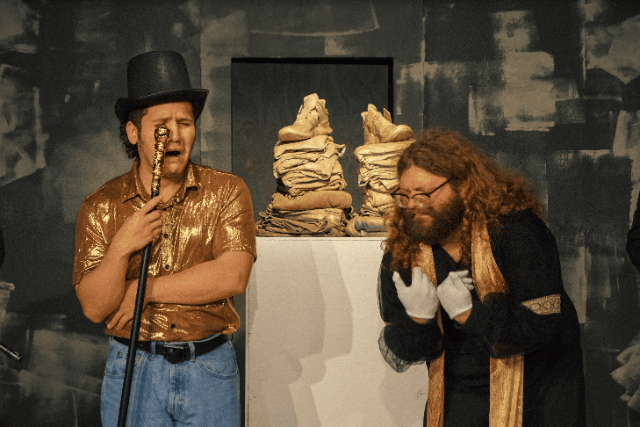 The rich lovers are among the minor characters. The leads are Tobin and Asher, two individuals somehow tasked with guarding a literally golden piece of state-sanctioned art. Little happens throughout the course of the play other than conversation between Tobin and Asher to pass the time of day and comedic antics from unwanted visitors. At the end of each scene, we hear a clock chiming. This sound effect (the sound designer is Alex Tarradell) suggests routine and monotony, reinforcing the characters’ bored existence.