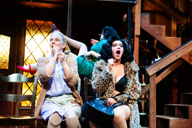 Dotty, a droll and delightful Julie Eccles, as the older housekeeper is the worst of the lot, unable to remember her lines or her blocking, but she is a financial backer of the show, a famed television star, and having an affair with the leading man (Joe Ayers as a bumbling Garry), so there is much reason for her to be there.