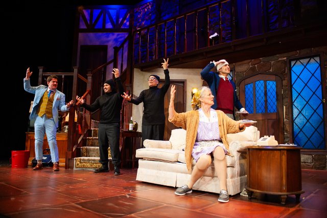 Doors and sardines. They are at the center of perhaps theater’s farciest farce and the definitive farcical metatheatrical play. On a set representing the two-story great room of a manor house in England, several doors feature significantly as they slam, sometimes in succession; get locked or opened when they shouldn’t; and reveal things that weren’t intended. A plate of sardines is a wayward prop that is often where it isn’t supposed to be; gets stuck to an actor’s hand; and creates an oily spot on the floor that is the cause of slips and falls. Lovers of farce will find the pratfalls of Noises Off just what the funny bone ordered.