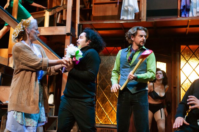 The whole of this San Francisco Playhouse production is a challenge to orchestrate, but Act 2 is particularly complex, and a masterful Director Bill English earns his spurs and more. The whole scene is a maelstrom, as actors and stage managers bicker and undermine one another endlessly. In one silent sequence, an axe changes hands several times with multiple attempts to put it to its intended use, only to be blocked with exquisite timing by a third party, sometimes casually or inadvertently.