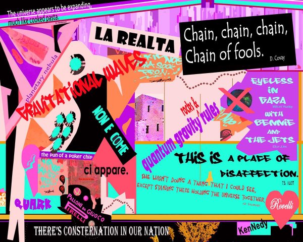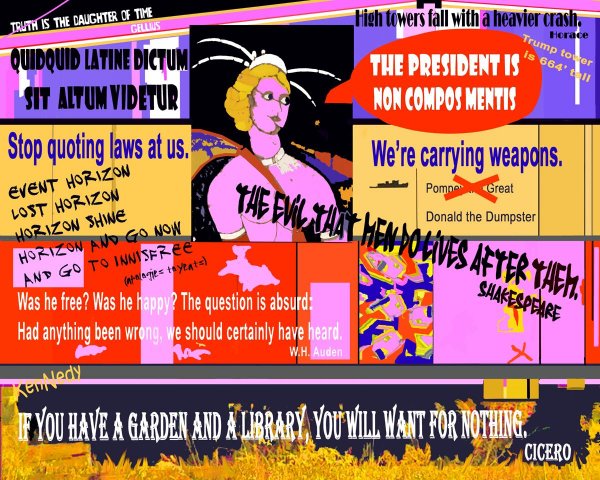The scope of this exhibit is threefold: the personal relates to family, health & illness, farms, food, music, and quantum gravity (for no discernible reason I became very interested in it). The poetical speaks for itself, and ranges from ancient Latin to the Beach Boys, with a heavy emphasis on Eliot, Auden, Bob Dylan, and Shakespeare. Where phrases appear without attribution, they are from my original poems. Finally, the political. We are at a very dangerous turning point in this country, and I feel any and every form of protest is not only appropriate but necessary if we are to regain any semblance of a democracy.