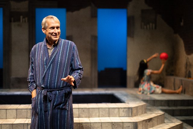 The production gets off to a strong start with the familiar tale of Midas. Because of a kindness the gods have granted him one wish. There are unheeded caveats when he wants whatever he touches to turn to gold. Initially, as well played by Edelman, he is dizzy with delight. A shell he has extracted from the pool is transformed as are the pebbles beneath his feet. There is no end to his increased fortune. Then his daughter (Evelyn Chen effective in multiple roles) embraces him and is transformed into a rigid sculpture. To reverse the spell he is tasked to travel to the edge of the world and seek redemption in a mystical pool. That occurs during the coda of the play.