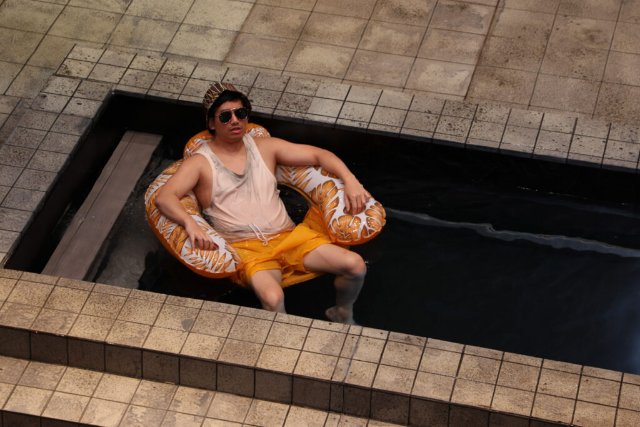 The play perked up with the tale of the spoiled brat Phaeton (Tim Liu). Hilariously Wolfe has him floating in an inflatable chair. He tells of arduous travel to seek his father Helios who illuminated the earth with his daily travel from East to West in a brilliant chariot. In a coming of age ritual he demands the opportunity, just for one day, to drive the chariot. Set in the present the chariot is represented by a sleek car. With many warnings the father forks over the keys with disastrous results. Phaeton screws up so badly that he is dispatched by a thunder bolt hurled by Zeus.