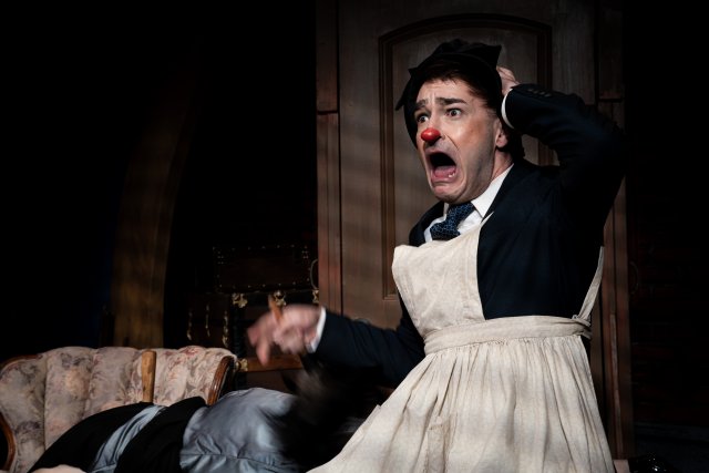 The actors, particularly Gabriel and Edean, wear red noses through much of the play, underscoring the clown motif. They hold nothing back as they gesture wildly and speak in exaggerated tones to bring the show’s eccentrics to vivid life. Time and space don’t allow a full list of their triumphs, but several moments stand out: a protracted groan that stretches on like a never-ending foghorn; the performer playing Mr. Memory flawlessly reciting a lengthy mathematical formula; and Hannay’s ingenious “escape” through a square-shaped object conjured out of thin air. In the finale, “snow” rains down on Hannay and Pamela—clearly dropped by actors visible onstage above. We know it’s make-believe, yet we happily suspend disbelief because the performers are so fully invested in the play’s joyous illusions.