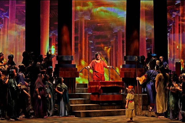 While the stage isn’t large enough to accommodate several columns from the temple physically collapsing at the conclusion, a combination of live action and graphics is used to depict the destruction. But for some reason, the simple act of the Philistines falling to the ground to demonstrate that Samson destroyed everyone in the temple does not occur. Notwithstanding these minor quibbles, the opera and this production are highly worthy and enjoyable.