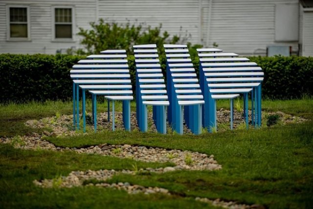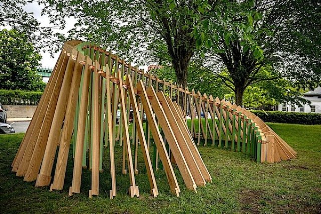 On the other hand, some of the wonderful Triennial pieces included This Moment for Joy by Boston artist Alison Croney Moses, a graceful undulating wall of wooden slats on a gradient curve representing the loving warm embrace and inspiration of important Black women in the artist’s life. Set at the Charlestown Navy Yard, Moses’s piece demonstrates how a minimalist approach to skillful woodcraft could create public art that evokes the warmth of a sanctuary in form and scale. Also at the Charlestown Navy Yard, Evelyn Rydz served up a splendid environmental installation, Convergence: Porous Futures. Created from an elegant grid of mirrors set on low posts — modeled on abstracted storm drain — the piece sat above winding lines of stones cut into the lawn, which depicts the confluence of the nearby Mystic and Charles Rivers. Like most of Rydz’s art, this work focuses on water infrastructure and its environmental impact in the context of increasing weather extremes.