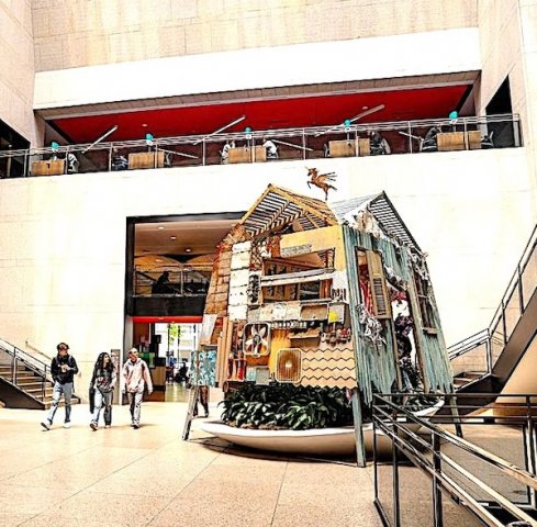 In the Well: The Stories We Tell About Addiction, by Swoon (aka Caledonia Curry) — located at Boston Copley Library’s central atrium — looks like a dilapidated cabin, pieced together from various recycled odds and ends; it sits dreamlike, floating on a small barge. The idea for the artwork sprang from the artist’s novella, “Sibylant Sisters,” a story about two sisters who live with a witch who subsists on a pernicious substance brewed in the well of toads. Drawing on this story from her adolescent imagination, Swoon questions how drug addiction is perceived, explained, and often misunderstood.
