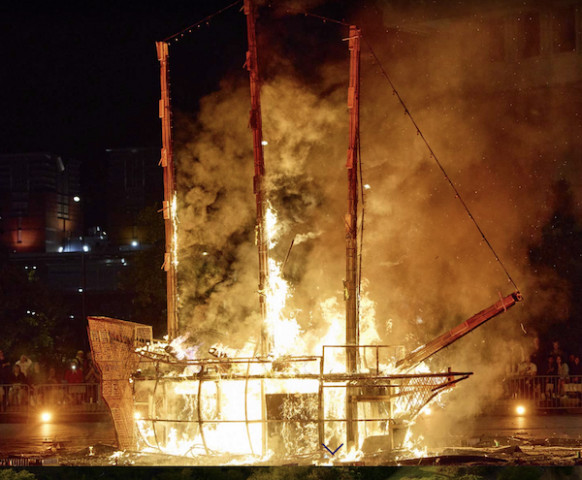 Most theatrical of all, Adela Goldbard of Providence and Mexico City erected an elegant, quarter-scale replica (32 ft long) of the type of 17th-century sailing ship that first brought European colonists to the Americas. She then burned it to the ground. Installed on Boston City Hall Plaza. The artist used the public spectacle of burning a colonial ship as the spectacular antithesis of a solid bronze statue of a founding father (“They invaded by sea, we responded with fire. An omen”).