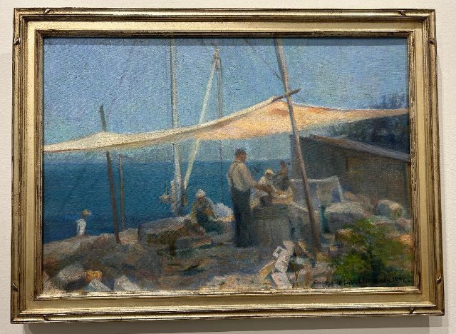 The more representational paintings augment the theme of the show. Gabrielle de Veaux Clements is a renowned Gloucester artist. She is represented here by “Motion at Folly Cove” a painting from 1894. It depicts workers making cobble stones under a protective canopy in the heat of summer. There is also a print on that subject.
