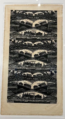 Eino A. Natti was a founder of Folly Cove Designers, he is represented by “Table Runner with Polyphemus” (1950). It is a narrow, vertical design created by linoleum block print on linen. The original intent was pragmatic though now it is framed as a work of art. Eino Natti was born in Gloucester to Finnish immigrants Erik and Matilda Natti. He graduated from the Boston Museum School and attended Northeastern University. Natti's sister Anna Stephanio and his sister-in-law Lee Kingman Natti were also Folly Cove Designers.