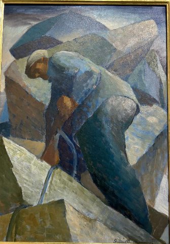 Once taken from the quarry there are works that focus on shaping the material into paving stones which were used all over America. We encounter a model of a sloop as well as a singular bravura painting of a five-masted schooner by the master Emile Gruppe.