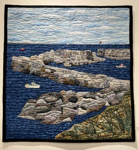 Some works prove fixating for their difference. There is a wonderful fabric piece by Dorothy Elizabeth Prouty who was a renowned Gloucester teacher. The familiar “Lane’s Cove” is lovingly captured in a 2017 work entailing appliqué, embroidery and cotton cloth. With charming nuance she captures the varying textures and colors of sky, water and that formidable granite structure that protects the intimate harbor. It’s one of my favorite sites to visit on Cape Ann.