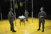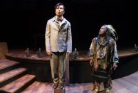 By: - Aug 06th, 2017Director Lilean Blais-Cruz does well with limited resources. Actors extract whatever drama and humor that the words allow. Lighting and sound achieve expected OSF standards. This production plays in the round and with a minimum of staging – the fixed portion being a number of vertical white pipes with light wands attached to a maze of pipes above.